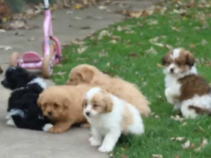 Ces jeunes Pomapoos jouent en extérieur avec enthousiasme. Ils courent et se chamaillent joyeusement, montrant toute leur énergie et leur nature sociable. Le Pomapoo, croisement entre un Loulou de Poméranie et un Caniche, est connu non seulement pour son caractère joueur mais aussi pour leur nature affectueuse, comme en témoignent ces adorables chiots.