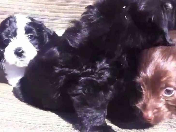 Ces petits chiots Doxiepoo sont tranquillement installés sur une chaise dans le jardin. Ils profitent ensemble des rayons du soleil en se reposant les uns contre les autres. De plus, ils n'hésitent pas à manifester leur mécontentement en faisant des petits couinements. Le Doxiepoo est un chien intelligent et sociable, issu du croisement entre le Teckel et le Caniche.