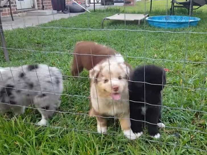 Ces jeunes German Australian Shepherd s'amusent en courant dans le jardin. Ils ont à leur disposition de nombreux jouets et même une petite piscine. Ils suivent leur maître partout, restant toujours derrière la clôture qui délimite le jardin. Le German Australian Shepherd est issu du croisement entre le Berger Australien et le Berger Allemand.