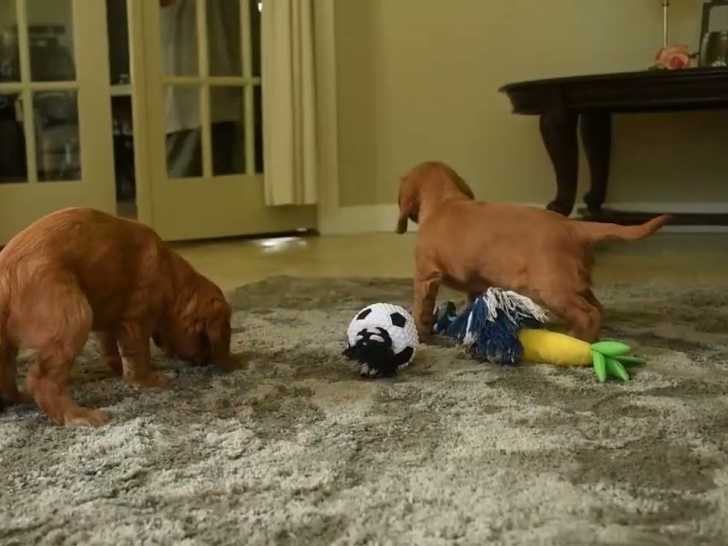 Ces jeunes Cockaliers au joli pelage brun découvrent leurs nouveaux jouets sur le tapis dans le salon. Très joueurs, ils n'hésitent pas à venir s'embêter les uns les autres dans la bonne humeur. Entourés d'enfants, les Cockaliers, issus du croisement entre le Cocker Anglais et le Cavalier King Charles Spaniel, ne se sentent pas déboussolés et bien au contraire, ils apprécient cela.