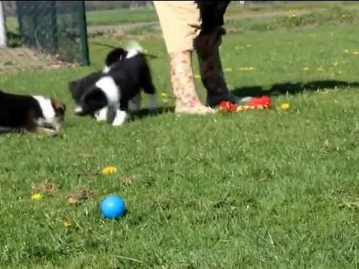 Ces adorables chiots sont des Cosheltie, issus du croisement entre un Berger des Shetland et un Border Collie. Ils sont sortis s'amuser dans leur grand jardin, où leur maître leur a apporté de nombreux jouets, tels que des balles ou des cordes. Bien qu’ils soient encore jeunes, ils débordent d’énergie et adorent courir dans tous les sens.