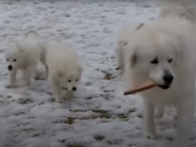 Voici des Bergers Slovaques qui s'en donnent à coeur joie d'être à l'extérieur. Sur une épaisse couche de neige qui recouvre entièrement le jardin familial, cette famille de Bergers Slovaques est en pleine partie de jeu sans se soucier du froid qui sévit dans les environs. Ils s'amusent avec un bâton en guise de jouet pour chien malgré une température assez basse.