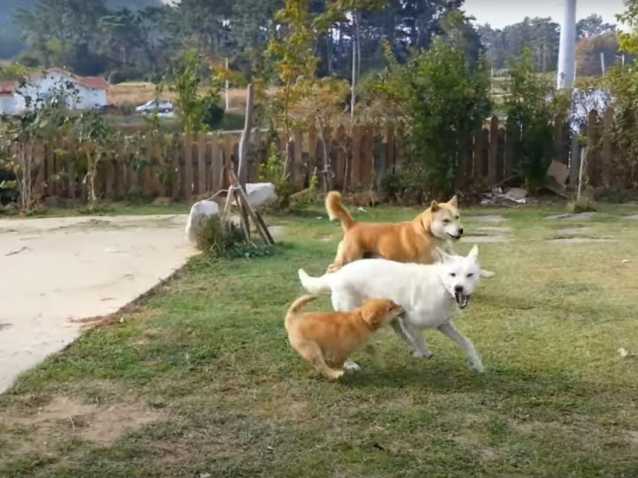 Voici une famille de Jindo Coréen qui a la belle vie. Ils passent du bon temps tous ensemble dans le spacieux jardin qui est à leur disposition.