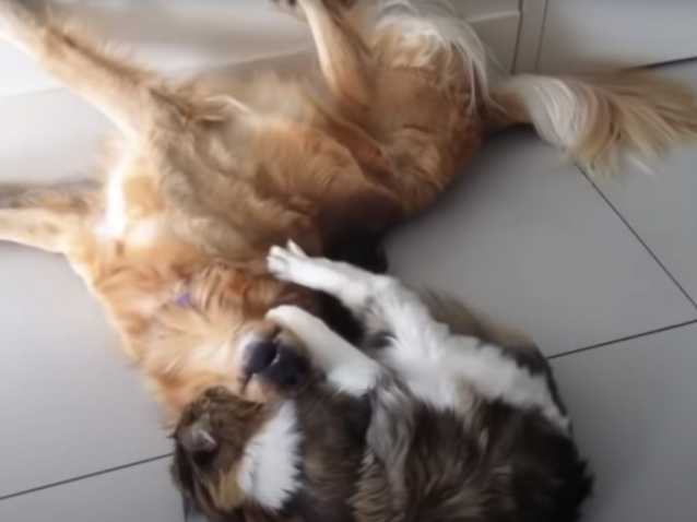 Bien installés au frais sur un carrelage blanc, un Maine Coon s’amuse avec un Golden Retriever. Ce chat et ce chien sont très complices et s’en donnent à cœur joie au cours de cette partie de jeu endiablée. Ils se mordillent et se jettent l’un sur l’autre, puis se roulent sur le sol tous les deux comme dans un match de lutte.