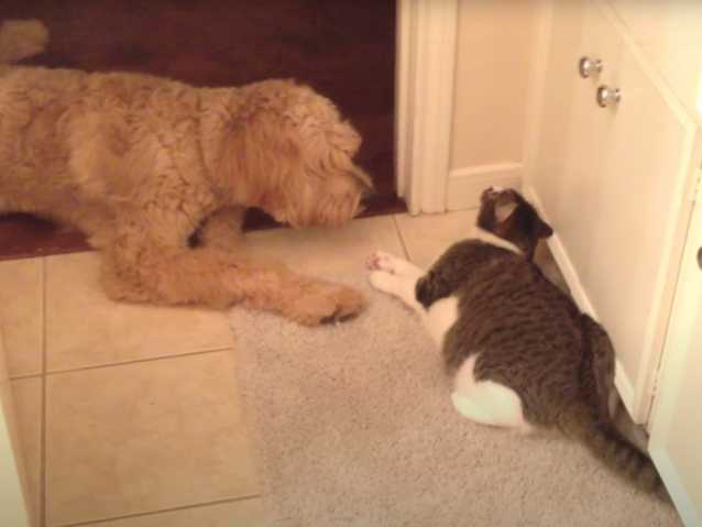 Tous deux installés sur le tapis de la maison, voici un Goldendoodle et un chat qui se querellent gentiment. En effet, le chien veut absolument jouer tandis que le chat n’en n’a pas décidé ainsi. Alors, le Goldendoodle aboie fort en s’excitant mais le chat ne se laisse pas faire, et lui fait savoir en l'avertissant avec des coups de pattes.