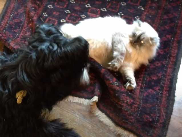 C’est dans le confortable salon d'une maison qu'un Briard joue avec un chat Himalayen. La situation est cocasse car le félin est allongé sur son dos tandis que son compagnon canin cherche à le taquiner et le chahuter. Les deux compères sont vraiment très complices et leur partie de jeu est amicale et sans aucune agressivité.