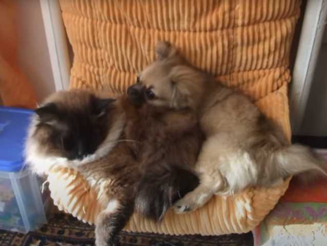 Voici un Epagneul Tibétain et un Sibérien qui sont tous deux installés confortablement dans le fauteuil du salon et ils sont ravis d’être ainsi collés l’un à l’autre. En effet, le gros chat Sibérien et l'Epagneul Tibétain prennent du bon temps ensemble. Ils sont tellement complices que le jeune chien fait même la toilette au chat du bout de sa langue.