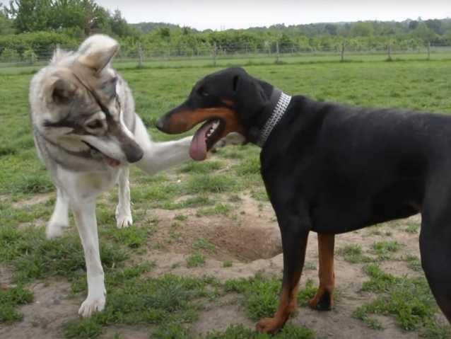 Très complices, un Dobermann et un Inuit du Nord jouent gentiment dans un parc. Sans aucune violence, ils se sautent dessus, se mordillent et se mettent de légers coups de patte.