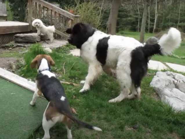 C’est sur le gazon verdoyant du jardin familial qu'un Landseer et un Beagle ont décidé de s’amuser. Ainsi, les deux chiens s’en donnent à cœur joie même s’ils sont de différent gabarit. Ils se poursuivent et le Beagle se cache souvent dans les buissons pour échapper au Landseer au cours de cette folle partie de jeu.