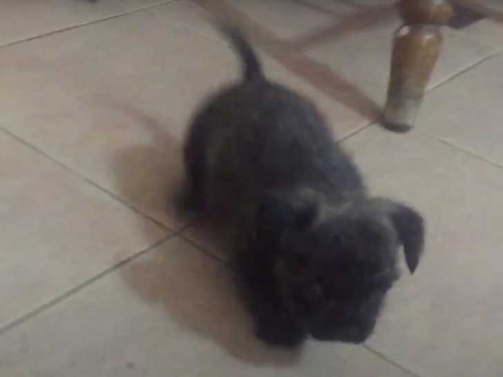 Ce jeune Boshih, résultat du croisement entre le Boston Terrier et le Shih Tzu, explore ses premiers instants dans sa nouvelle maison. Il glisse maladroitement sur le carrelage et cherche à mordiller les pieds d'une chaise. Tout cela se déroule sous le regard attentif des autres chiens présents dans la pièce, qui se questionnent sur l'arrivée de ce nouveau compagnon dans la maison.