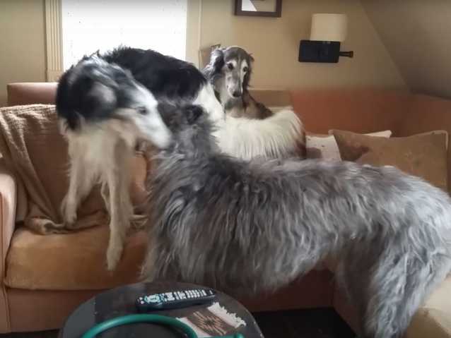 Cette vidéo illustre l'importance du jeu pour le chien. Ce Lévrier Écossais et ses deux congénères Lévriers de Soie s'amusent ensemble calmement. Outre le plaisir évident qu'ils y prennent, le jeu permet aussi d'éprouver leur liens et d'instaurer ou de confirmer leurs rapports hiérarchiques en simulant un affrontement. Le jeu est aussi un facteur d'intégration de tout nouveau venu en cas de cohabitation de plusieurs chiens.