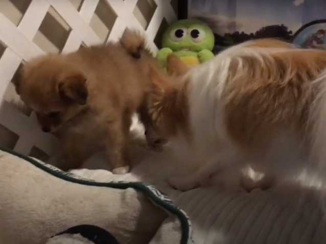 C’est au sein d'une vaste demeure familiale qu'un chiot Pomchi va faire la connaissance d’un Loulou de Poméranie. Et après quelques hésitations, ces deux-là vont se sentir mutuellement pour finir par se câliner et passer le reste de la journée collés l’un à l’autre comme des amis.