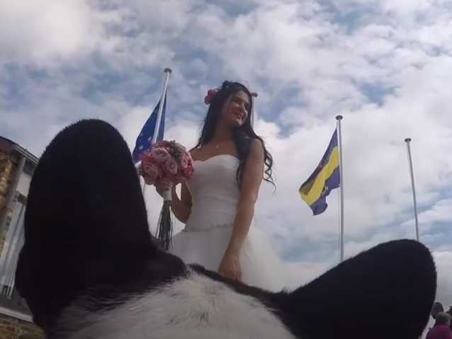 Ce couple a eu la curieuse idée de faire filmer leur mariage par leur chien, un Bouledogue Français, portant une caméra sur le dos. On assiste ainsi à toute une cérémonie du point de vue d'un petit chien. Au-delà du caractère amusant de l'expérience, cela permet de prendre conscience de la vision qu'ont les chiens de notre monde d'humains.