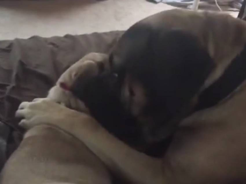 C'est l'heure des câlins et des bisous pour Gunner et Dolly, deux English Mastiff. Le gros mâle prend soin de la petite chienne, qui est encore un bébé, et lui offre affection et tendresse. Nul doute que pour les maîtres, ce duo va former un joli couple : peut-être de futurs chiots en perspective ?