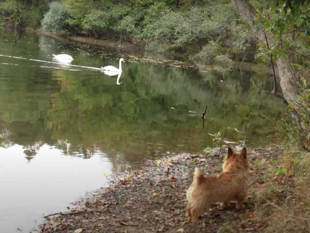 Bien posté sur le bord d'un étang, voici un Norwich Terrier qui observe avec curiosité de majestueux cygnes blancs avançant sur l’eau. Il est très surpris et conquis par l’étrangeté de ces volatiles, et ne cache pas une certaine excitation en faisant des aller-retours vers son maître qui tente de le rassurer.