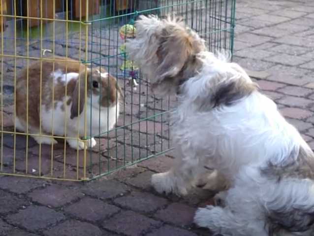 Un lapin a beau être enfermé dans une cage, il n’en attire pas moins l’attention d'un Petit Basset Griffon Vendéen. En effet, ce chien étant curieux, il s’approche des barreaux de la cage espérant ainsi pouvoir toucher le lapin du bout des pattes. Ne parvenant pas à ses fins, il aboie donc pour signifier son mécontentement de ne pas pouvoir s'amuser avec son ami.