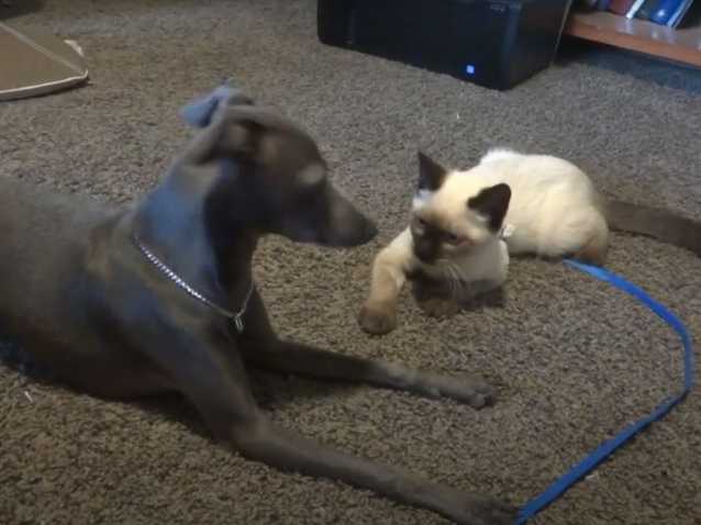 Cette vidéo montre un moment de jeu entre un Petit Lévrier Italien et un Siamois. De toute évidence, il s'agit d'un exemple de cohabitation réussie entre un chien et un chat. Ils savent jouer longuement ensemble sans se faire de mal et semblent y prendre beaucoup de plaisir.