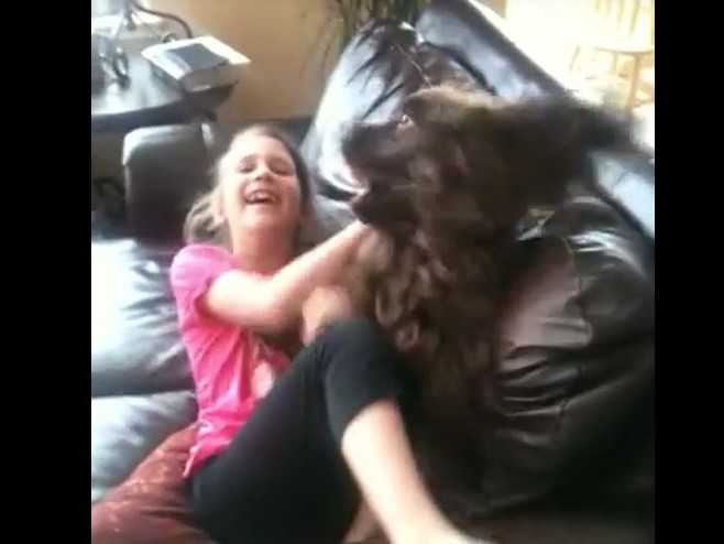 Une petite fille, Aviva, s'amuse sur le canapé avec son Sussex Spaniel! Câlins, léchouilles, et chatouilles, le chien et la jeune fille ont l'air de beaucoup s'amuser. Le Sussex Spaniel est adorable avec les enfants et le duo semble être très complices. La petite fille rit aux éclats, alors que le chien s'amuse à passer sur elle pour jouer.