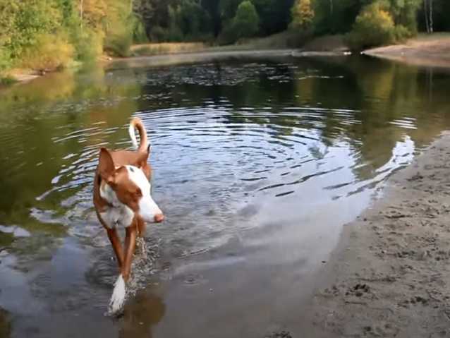 Un cours d'eau avec une petite plage naturelle se trouve sur le chemin de leur balade. Qu'à cela ne tienne, les deux chiens continuent leurs jeux en pataugeant dedans et en creusant le sable de la plage.