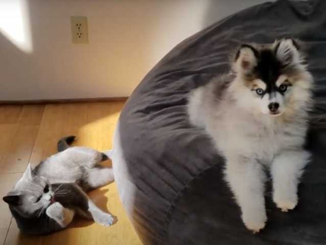 Voici un ravissant Pomsky et un chat tout aussi magnifique qui sont les meilleurs amis du monde. Bien installés sur le pouf familial, ils se ruent l’un sur l’autre dans une ambiance bon enfant.