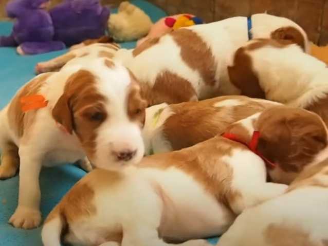 Ils sont au moins une dizaine de chiots Setter Irlandais Rouge et Blanc à téter leur mère avec grand appétit.
