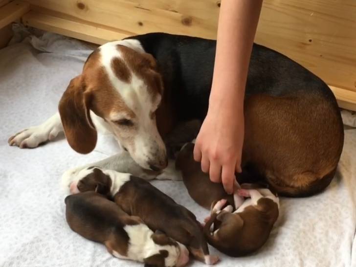 Cette vidéo montre une portée de quatre chiots de race Brachet Allemand en compagnie de leur mère. Ils sont âgés de seulement deux jours, et passent la plus grande partie de la journée à dormir ou à téter. La chienne prend soin de ses petits en les léchant et en s'allongeant auprès d'eux pour leur tenir chaud. Leur maîtresse tend sa main pour les caresser et propose des friandises.