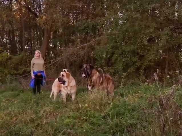 Quoi de mieux qu'une longue et belle promenade dans la nature afin de se dégourdir les pattes et garder la forme, pour ce groupe de chiens composés de Mâtins Espagnols et de Mastiffs. Ils s'entendent d'ailleurs très bien entre eux.