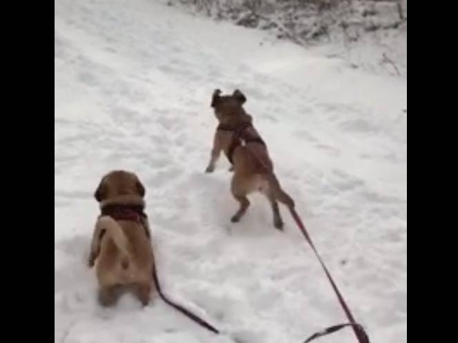 Qui a dit que seuls les huskys qui pouvaient être chien de traineau? Ces Puggles ont bien l'intention de prouver le contraire à leur jeune maître et, amarrés à sa luge, ils l'emportent pour une course au milieu des sapins, sous les regards impressionnés de leurs congénères, et notamment d'un Husky.