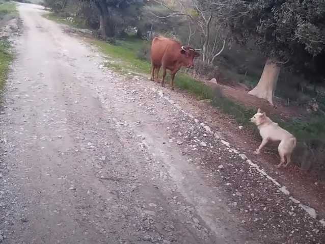 Le Chien de Canaan s'approche du bovin et essaie de le dégager du chemin. Il lui aboie dessus, tourne autour de lui et essaie de l'attirer loin de son maître. Ce dernier profite que la route soit libre pour pédaler loin de l'imposante bête.