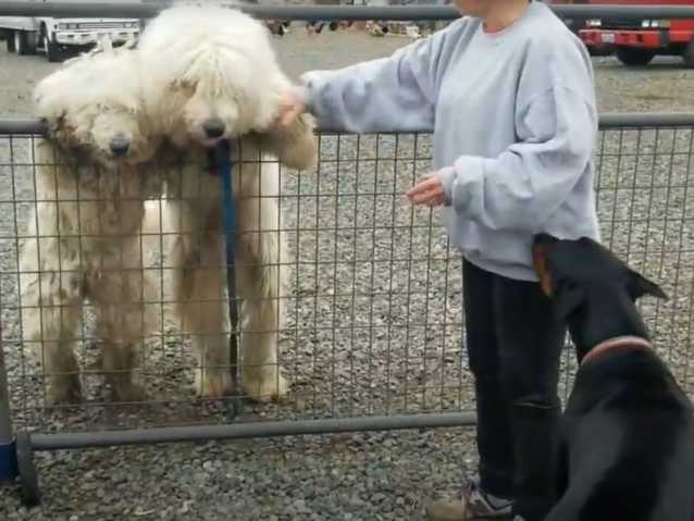 Un Dobermann découvre un couple de Komondor un peu bruyants et agités. Ils sont simplement curieux, mais le premier semble timide et n'ose pas les approcher tout de suite. Peut-être est-ce le comportement de ses maîtres qui restent calmes près des Komondor qui l'incite à les rencontrer enfin et les flairer de près.