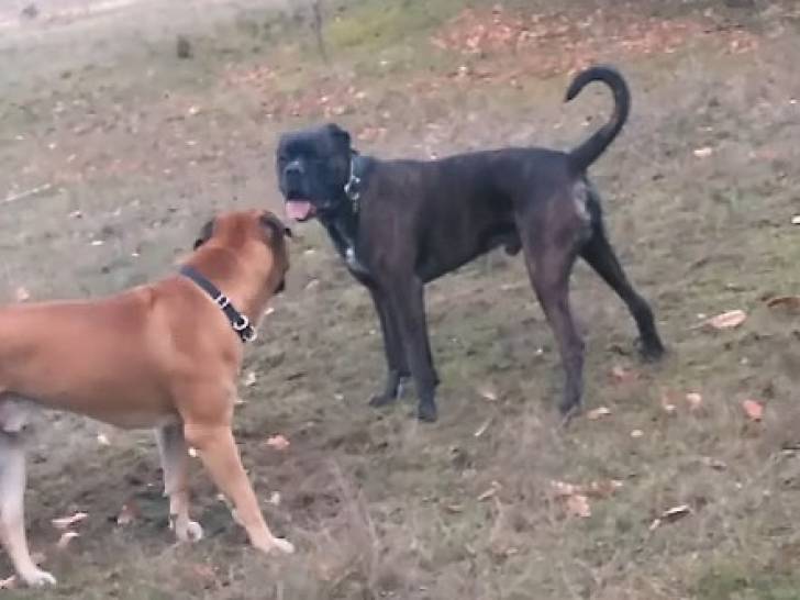 Cette vidéo montre la rencontre dans un parc de deux chiens de grand gabarit, un Cane Corso et un Boerboel. Ils semblent plutôt complices et se lancent dans une course-poursuite au rythme effréné. Ils simulent ensuite un combat en se poussant et se mordillant. Leur propriétaire filme cette séquence de jeu nécessaire au bien-être des chiens et utile pour leur sociabilité.