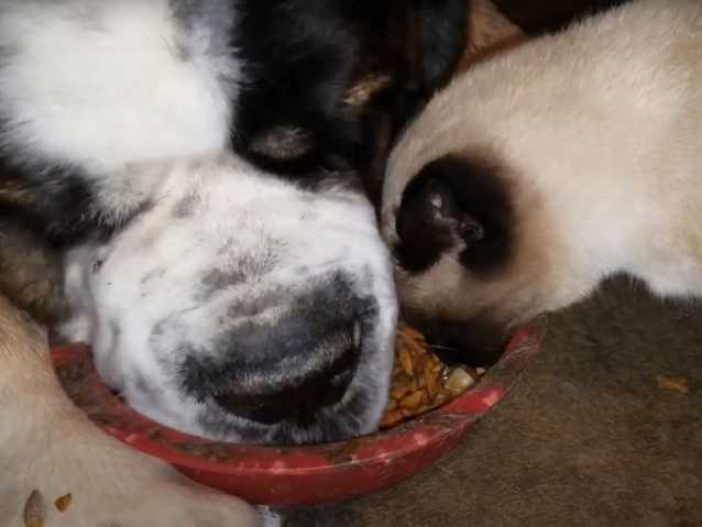 Même si le Saint-Bernard et le Siamois ont beau avoir une énorme différence de taille, puisque la tête du chien de montagne représente quasiment le corps du chat, ils n’en partagent pas moins la même gamelle. En effet, le molosse laisse son compagnon félin se nourrir à ses côtés, sans broncher ! La situation est très cocasse et attendrissante.