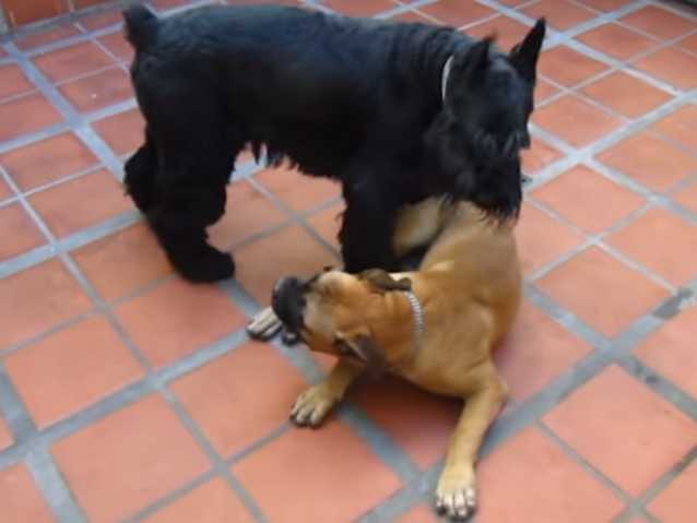 Un Schnauzer Géant et un Bullmastiff, deux chiens au physique impressionnant, commencent à jouer ensemble. Au regard de la crainte que peuvent inspirer des animaux de ce gabarit, on pourrait s'attendre à des échanges assez durs, sinon brutaux, entre eux. Au contraire, ces deux gros chiens jouent avec douceur et calme, ce qui montre leur capacité à se contrôler et leur volonté de ne pas être dangereux.