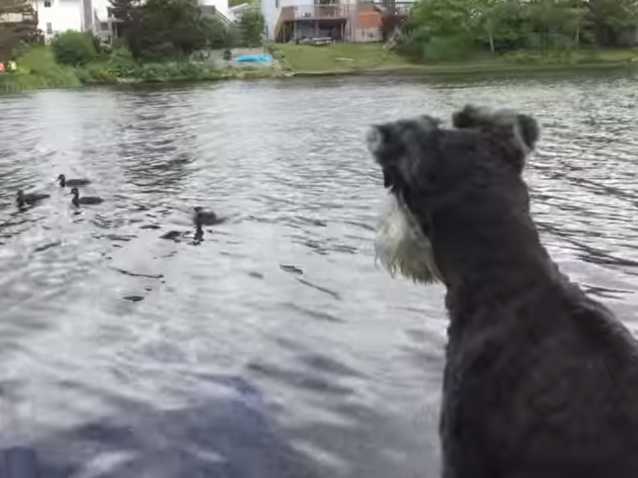 Voici une vidéo qui montre un Schnauzer Nain en train de se promener le long d'un cours d'eau. Apercevant un groupe de canards sur le fleuve, le jeune chien cherche à les attraper et il n'hésite pas à mouiller ses pattes au bord de l'eau. Mais heureusement pour les oiseaux, ce Schnauzer Nain ne sait pas nager !