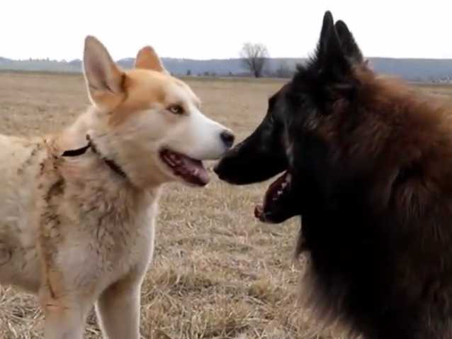 Voici une belle séance de jeu entre un Berger Belge Tervueren et un Husky Sibérien. Les deux chiens semblent se connaître depuis longtemps comme le montre leur évidente complicité. Comme il s'agit ici de deux races très dynamiques, leur course n'est pas facile à suivre et nécessite de la part du caméraman une condition physique certaine.