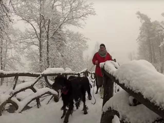 Dans une forêt recouverte d’un épais manteau de neige, ces Setter Gordon s’amusent comme des fous. Ils partent ainsi en groupe pour une longue randonnée à travers les bois enneigés, pour leur plus grand bonheur mais aussi celui de leurs maîtres respectifs.