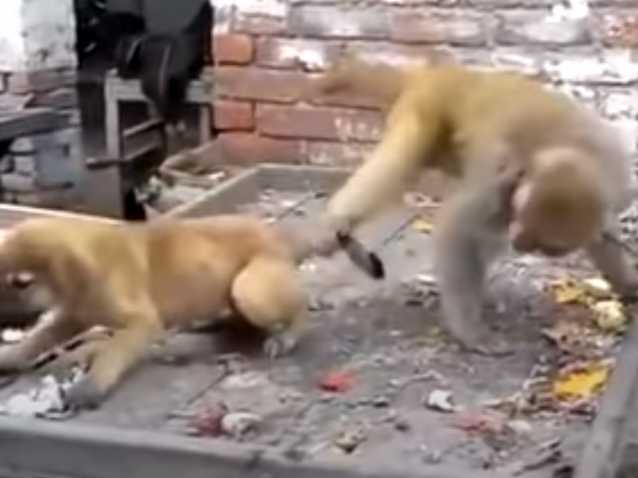 Un singe macaque s'amuse dans cette vidéo à tirer la queue d'un jeune chien. Ce dernier ne se laisse pas faire et aboie pour le faire lâcher, mais le quadrumane revient encore et encore à l'attaque. Il est difficile d'interpréter leur comportement. S'agit-il de curiosité de la part du singe aux dépens du canidé ou d'un jeu convenu entre eux ? Il n'y a en tout cas aucune agressivité évidente d'un côté comme de l'autre.