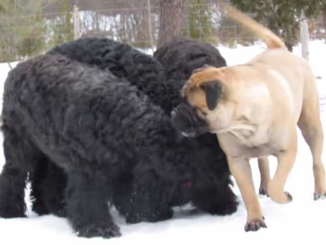 Voici donc une vidéo qui montre plusieurs Terriers Noirs Russes en train de s'amuser avec un Bullmastiff.