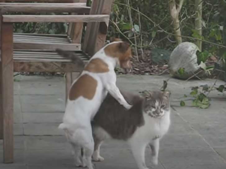 Cette vidéo montre une scène assez insolite d'un chien qui essaie de s'accoupler avec un chat. Ce dernier, placide, ne montre aucun signe de rejet. Le chien ne semble pas avoir remarqué qu'il s'est approché d'un animal d'une autre espèce. Un exemple assez surprenant de l'entente entre chiens et chats...