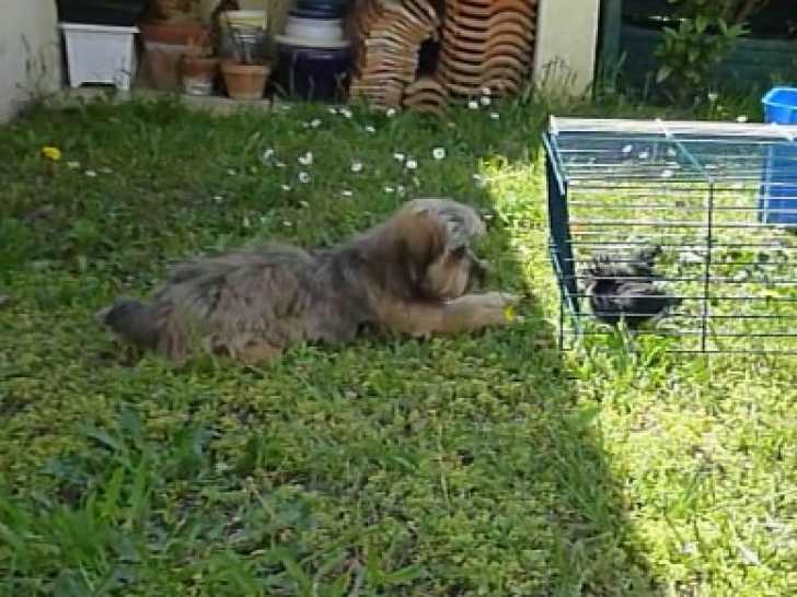 Ce Shorkie, nommé Iggy, profite du soleil dans son jardin. Ses propriétaires ont déposé une petite cage au sol, dans l'herbe, contenant trois petits oiseaux. Iggy s'en approche doucement, sans aboyer, et observe les oiseaux avec curiosité. Le Shorkie est un croisement entre le Shih Tzu et le Yorkshire Terrier, c'est un compagnon qui peut se montrer calme et doux.