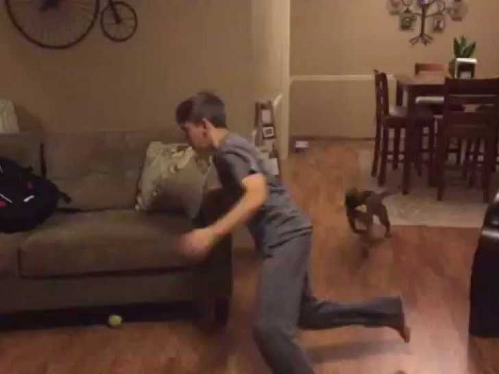 Bentley, un Cocker Pug (race hybride aussi connue sous le nom de Pucker), s'amuse à poursuivre son jeune maître autour du canapé. Il court aussi vite que possible et il est tellement concentré sur sa poursuite, qu' il perd son jouet jaune en cours de route. Cependant, il semble être ralenti par le parquet qui est visiblement très glissant, car à chaque tour, il glisse au même endroit. Malgré cela, il parvient à ne jamais abandonner.