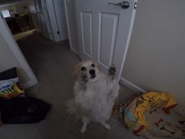 Ce Corgipom avance doucement dans la chambre de sa maîtresse lorsqu’elle l’appelle. Il se dresse sur ses pattes arrière pour l’atteindre et réclamer des caresses. Sa maîtresse lui fait quelques caresses sur le ventre avant qu’il ne reparte. Le Corgipom est issu du croisement entre le Loulou de Poméranie et le Welsh Corgi Pembroke.