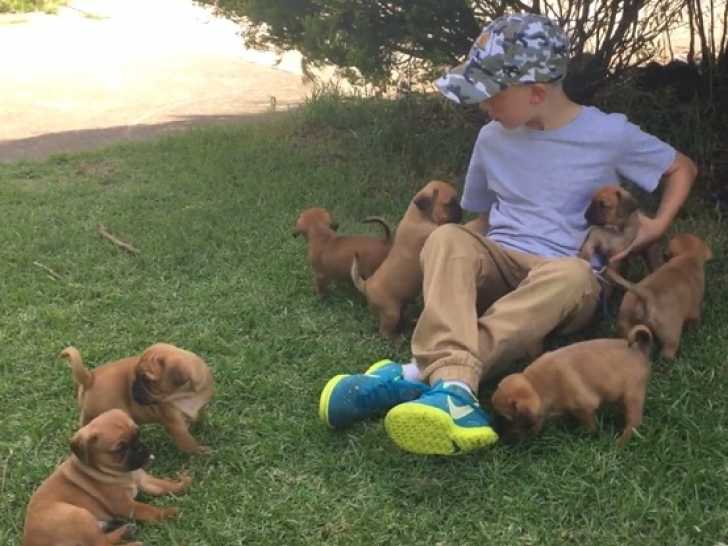 Cette famille a accueilli plusieurs chiots Pugalier. Ces petits compagnons adorent passer du temps avec leurs propriétaires, jouant dans l’herbe du jardin et appréciant les caresses que leur donne cet enfant. Le Pugalier, un croisement entre le Carlin et le Cavalier King Charles Spaniel, est connu pour son caractère affectueux et sociable.