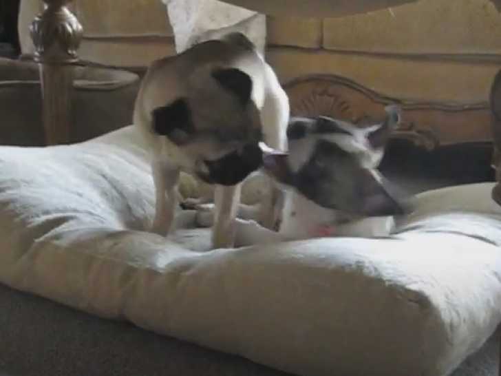 Cette French Bullnese partage son panier avec un autre chien très joueur. Ensemble, ils s'amusent à faire semblant de se battre. Ils se poursuivent dans la maison, se roulent par terre, se donnent des coups de patte ou essaient de s'attraper. Le French Bullnese est issu du croisement entre un Bouledogue Français et un Pékinois.
