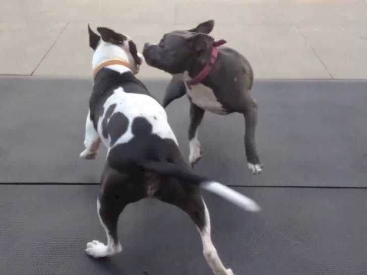 Duncan est un adorable Frenchie Staff. Il s'amuse à l'extérieur, derrière des grillages, avec une balle de tennis et un autre chien. Ils se poursuivent et font semblant de s'attaquer tout en se sautant l'un sur l'autre. Duncan, issu du croisement entre un Bouledogue Français et un Staffordshire Bull Terrier, est sociable, énergique et joueur.