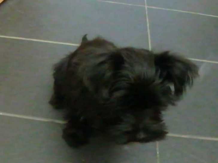 Ce petit Weshi au pelage noir de quatre mois regarde tendrement sa maîtresse. En effet, il la regarde comme s'il attendait quelque chose d'elle et lui donne la patte quand cette dernière le lui demande gentiment. Toujours avec des yeux remplis d'amour, ce Weshi issu du croisement entre le West Highland White Terrier (Westie) et le Shih Tzu s'allonge sur le sol avant de se faire féliciter par sa propriétaire.