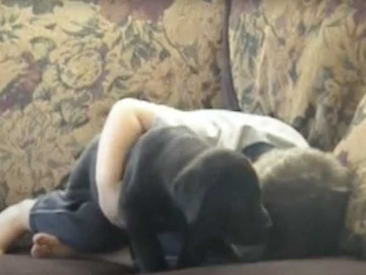 Ce chiot Bullmasador est dans les bras d'un petit garçon sur le canapé. Ils se font des câlins et ce petit Bullmasador semble adorer les caresses. De plus, le Bullmasador est de manière générale un chien très doux, calme et protecteur issu du croisement entre le Bullmastiff et le Labrador Retriever.