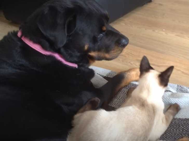 Cette vidéo montre un chat de race Siamois en plein moment de tendresse avec un chien. En effet, les deux compères sont très complices : ils se câlinent, se lèchent tendrement, et le félin se frotte même sur son copain pour s'endormir contre lui. La cohabitation entre ce chat et ce chien semble se dérouler à merveille.