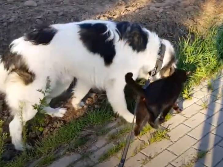 Un Tornjak se promène tranquillement en laisse, accompagné d’un chat qui ne le quitte pas d’une semelle. Le chat cherche constamment le contact, se frottant contre lui et réclamant des marques d’affection tout au long de la balade. Cette scène met en évidence une relation particulièrement complice entre les deux animaux, faite de confiance et de douceur.