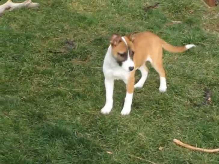 Holly est une Australian Boxherd, issue d’un croisement entre un Boxer et un Berger Australien. Elle est sortie s’amuser dans le jardin, accompagnée de son maître. Holly adore courir dans l’herbe et profiter des caresses que ses propriétaires lui donnent. Elle s’entend également très bien avec les enfants et adore jouer avec eux.
